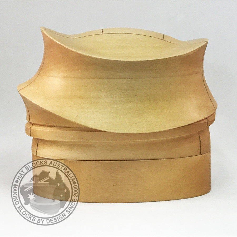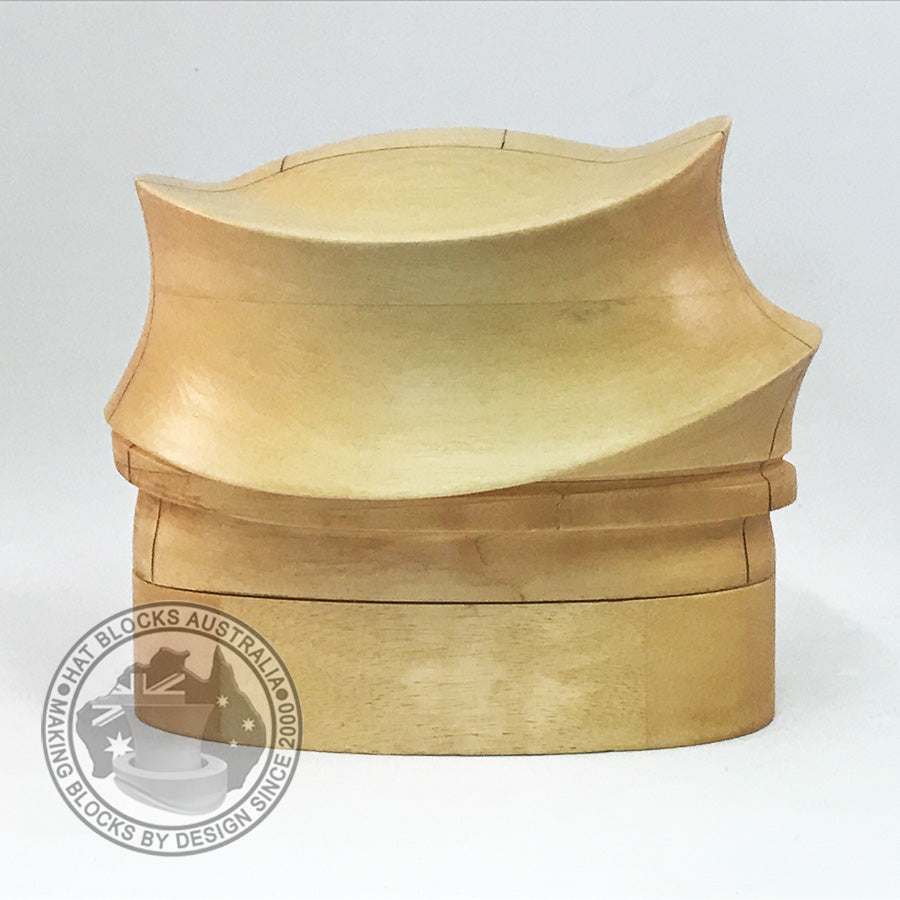 Faithful reproduction of a vintage American Hat Block company 2430 block. Designed to be worn high and towards the back of the head. Part of the blocked form collapses up inside of the finished hat.